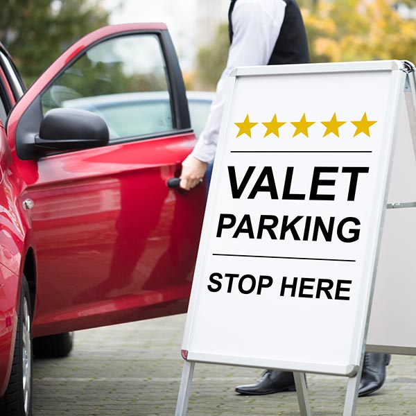With our team, decked head to toe in elegant attire, you can’t go wrong choosing our valet parking attendants to cater to your party. We even have our station organized and sanitized to welcome in your guests as they pull up. An umbrella, podium and carpet are rolled out to greet these cars with high-class happiness.